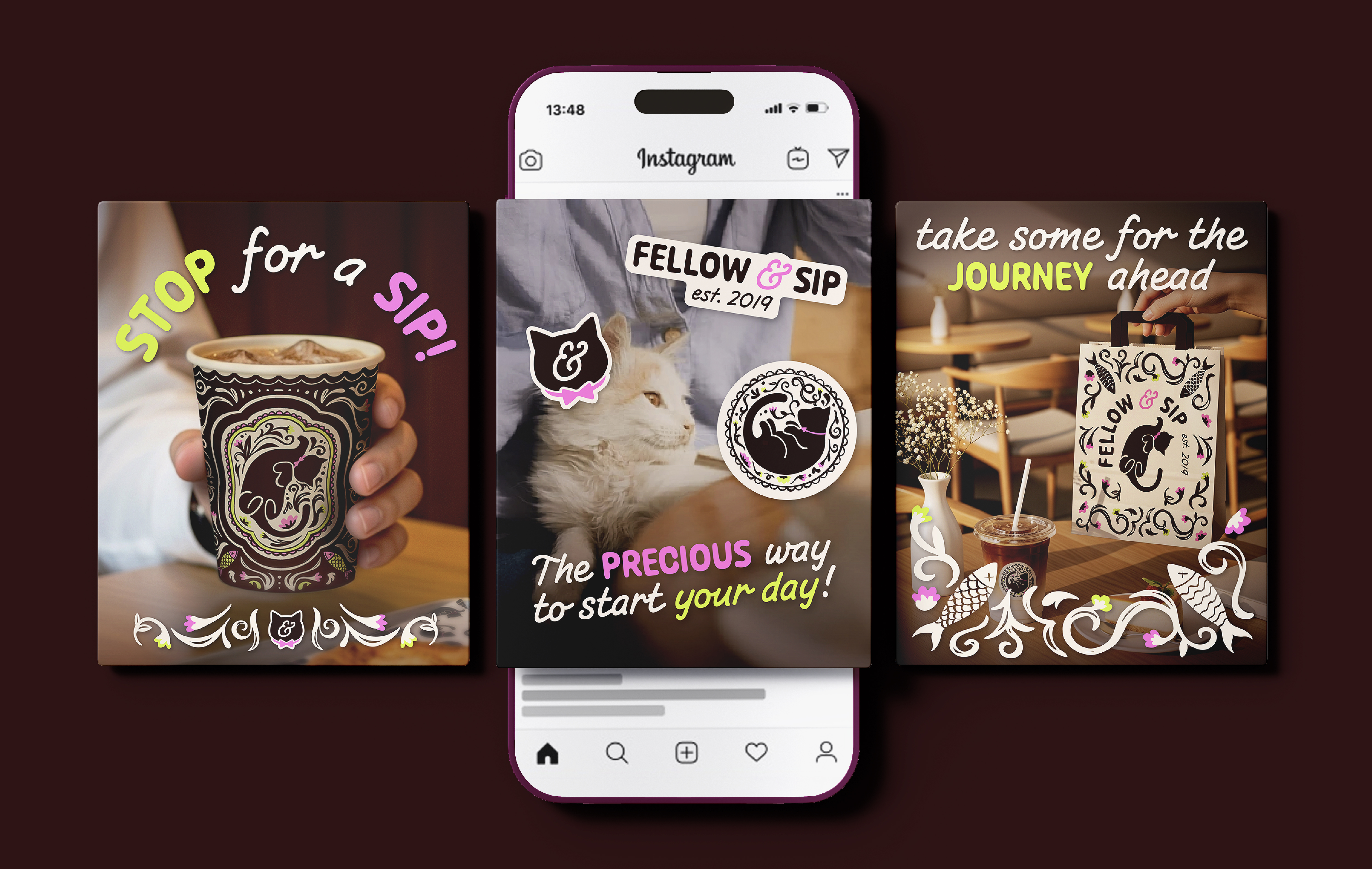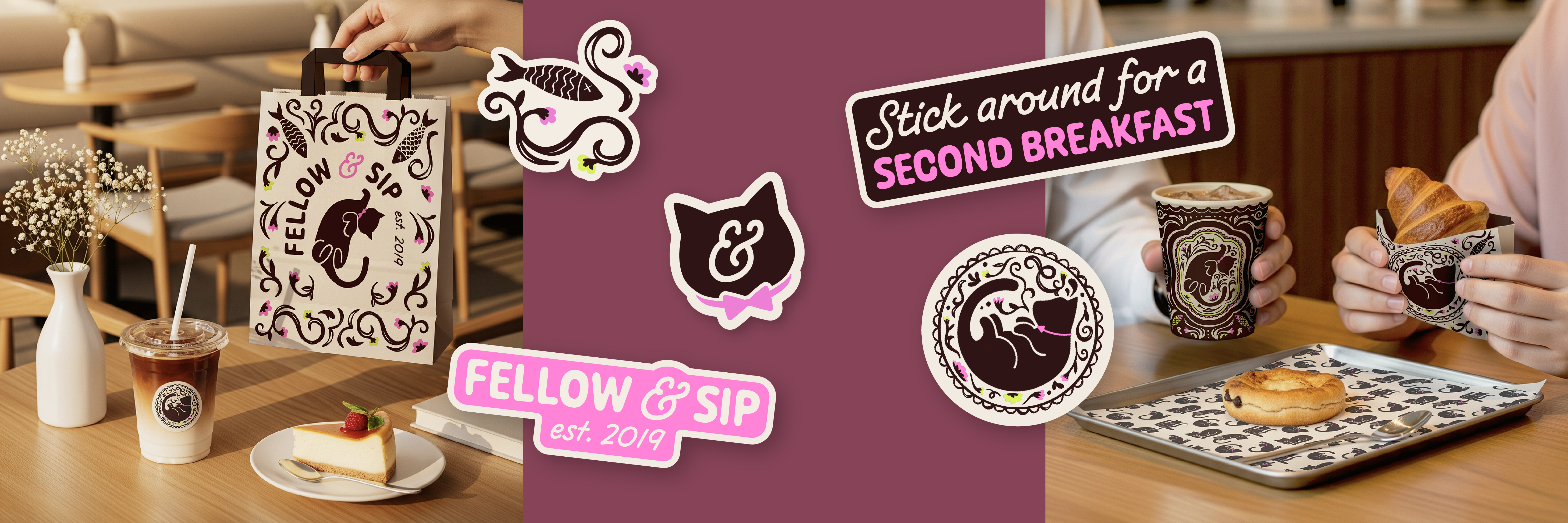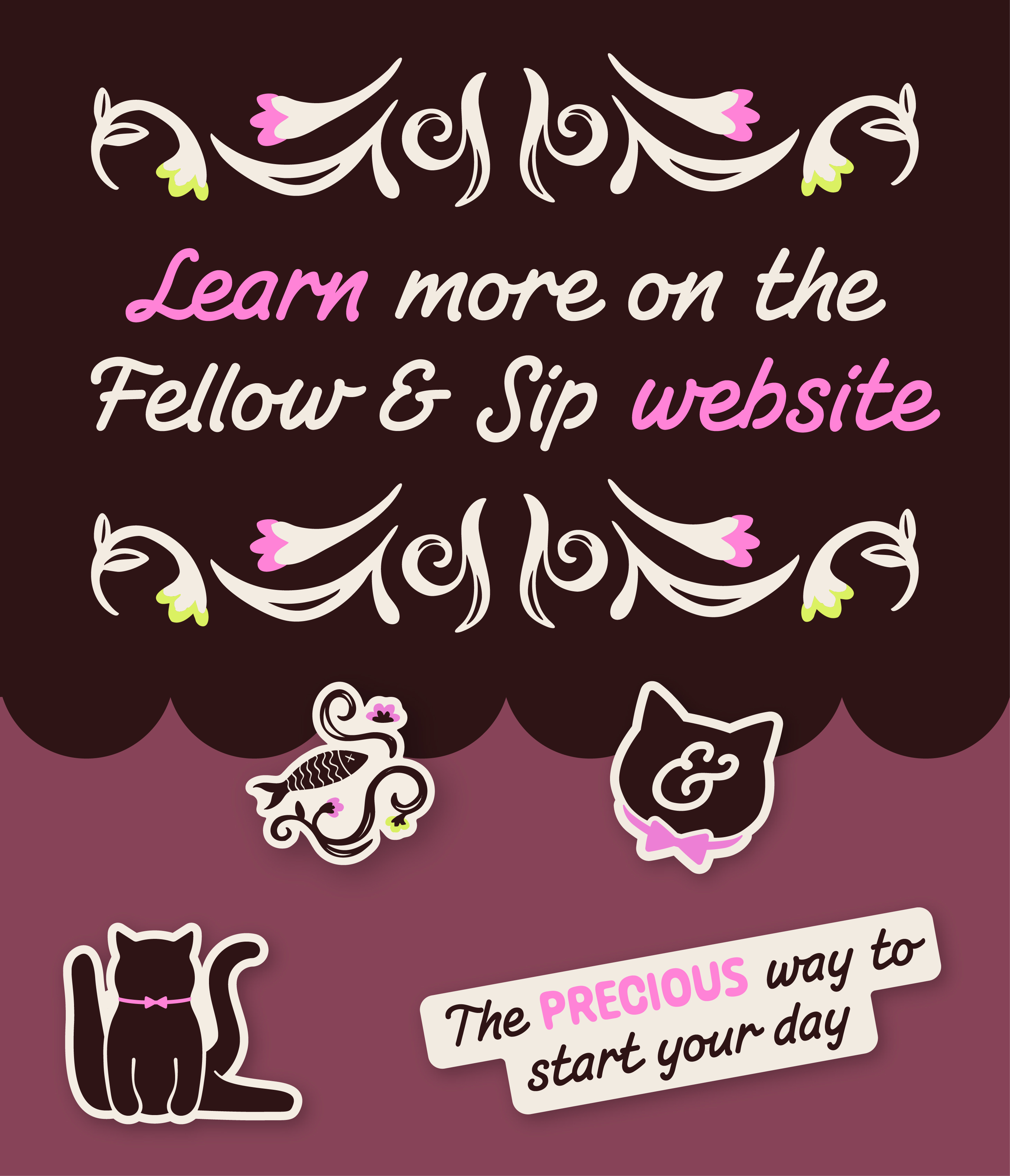 Fellow & Sip is a brand concept for a fictional cat cafe inspired by my own pet cat, Frodo. With a delicious selection of drinks, and a designated cat lounge, the cafe provides a sanctuary for coffee drinkers and cat lovers alike. Its welcoming, whimsical atmosphere makes Fellow & Sip the ideal place for anyone to spend their day.